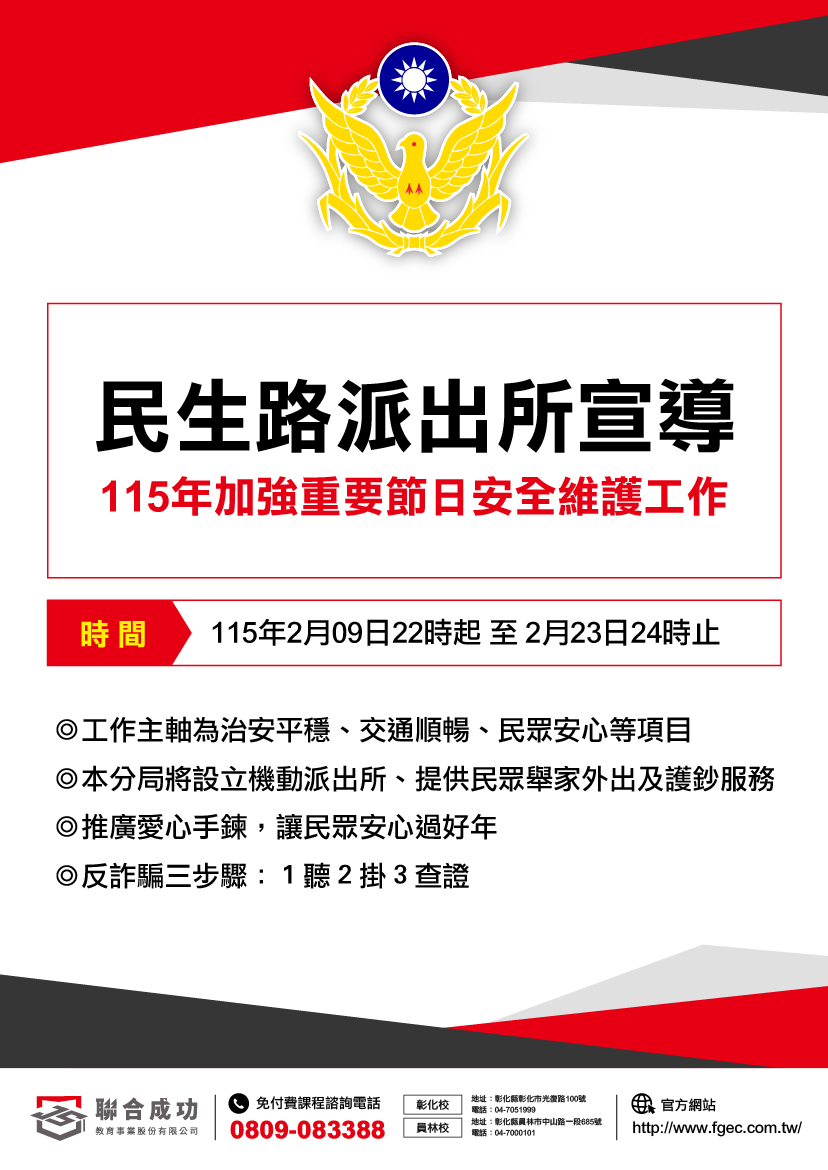 最新消息 訊息公告 [民生路派出所宣導] 115年加強重要節日安全維護工作 Tags: 安全維護工作, 宣導, 民生路派出所 Continue Reading Previous [最新] 軍警專校榮耀榜Next [莒光所宣導] 115年加強重要節日安全維護工作 相關文章 最新消息 訊息公告 [莒光所宣導] 115年加強重要節日安全維護工作 最新消息 榜單會說話 照片 特色 訊息公告 [最新] 軍警專校榮耀榜 最新消息 榜單會說話 照片 特色 訊息公告 [最新] 高職統測國立科大超強金榜