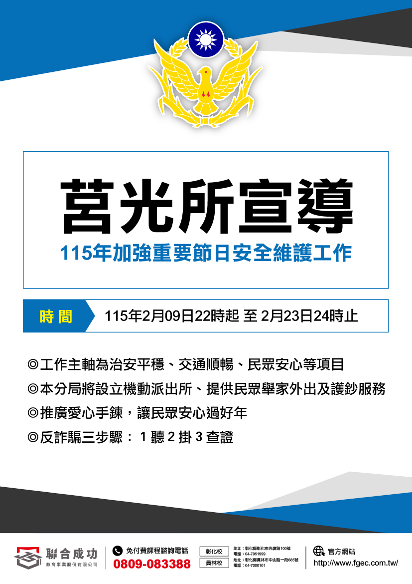 最新消息 訊息公告 [莒光所宣導] 115年加強重要節日安全維護工作 Tags: 安全維護工作, 宣導, 莒光所 Continue Reading Previous [民生路派出所宣導] 115年加強重要節日安全維護工作 相關文章 最新消息 訊息公告 [民生路派出所宣導] 115年加強重要節日安全維護工作 最新消息 榜單會說話 照片 特色 訊息公告 [最新] 軍警專校榮耀榜 最新消息 榜單會說話 照片 特色 訊息公告 [最新] 高職統測國立科大超強金榜